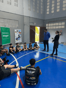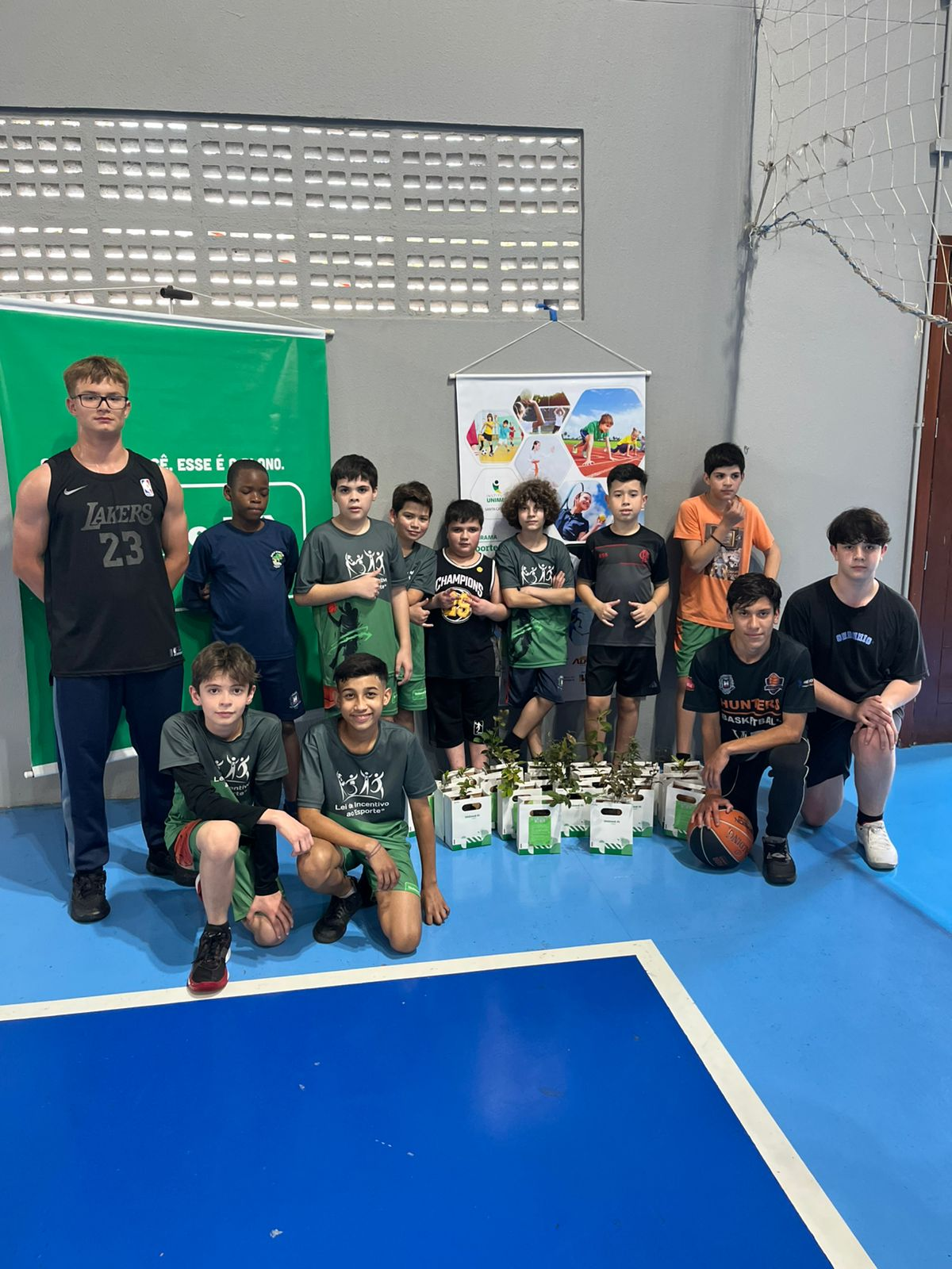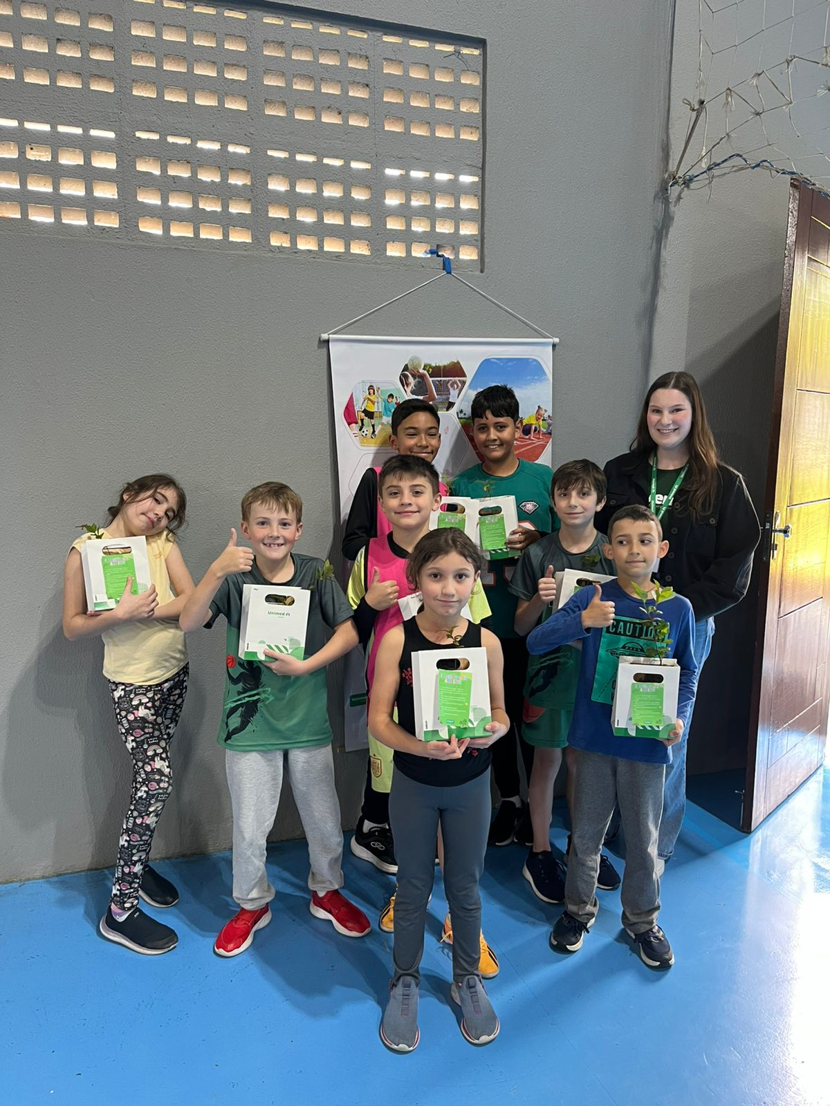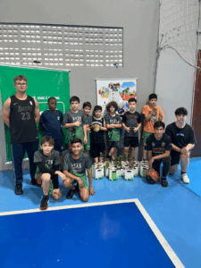 Uma das ações desenvolveu-se em parceria com o projeto social da filial Caçador, na modalidade de Basquetebol, onde representantes da Unimed estiveram com os alunos para uma conversa sobre o uso consciente da água, a importância da separação correta do lixo e práticas simples de preservação ambiental. Ao final do encontro, cada aluno recebeu uma muda de árvore e um folheto explicativo com orientações sobre o plantio e os cuidados necessários. A proposta é incentivar o cultivo de árvores em casa, despertando desde cedo o sentimento de responsabilidade ambiental.